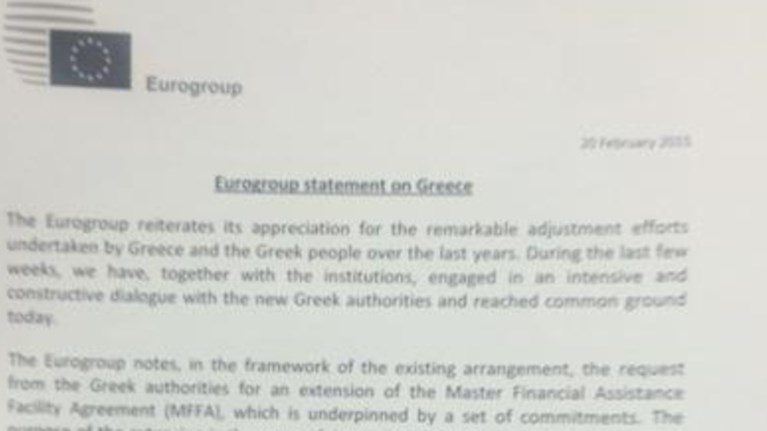 το αίτημα από τις ελληνικές αρχές για μία παράταση της Master Financial Assistance Agreement (MFFA), η οποία υποστηρίζεται από μία σειρά δεσμεύσεων. Ο σκοπός της επέκτασης είναι η επιτυχής ολοκλήρωση της αξιολόγησης με βάση της προϋποθέσεις στην τρέχουσα συμφωνία, κάνοντας την καλύτερη δυνατή χρήση της δεδομένης ευελιξίας η οποία θα εξεταστεί από κοινού με τις ελληνικές αρχές και τους θεσμούς. Αυτή η επέκταση θα γεφυρώσει επίσης τον χρόνο για συζητήσεις για μία πιθανή επόμενη (follow-up) συμφωνία μεταξύ του Eurogroup, των θεσμών και της Ελλάδας.